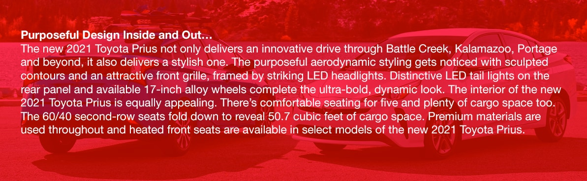 Maximize your daily commute on the Battle Creek, Kalamazoo and Portage streets and highways with the new 2021 Toyota Prius. The purposeful design and Hybrid powertrain of the new 2021 Prius encourages you to embrace more efficiency on the Western Michigan roadways. Its agile contours and sleek flowing lines, along with an active grille shutter, aero stabilizing fins and underbody panels all work together to smooth airflow and ultimately maximize fuel economy. Above all, Battle Creek, Kalamazoo and Portage drivers can experience up to 58 MPG in city driving and up to 53 MPG in highway driving with the new 2021 Toyota Prius.Ā